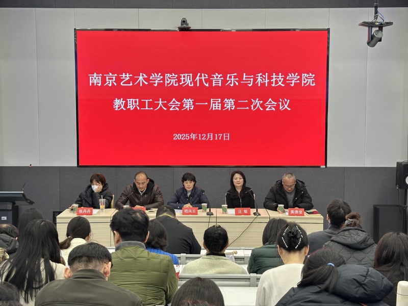 12月17日中午冬日暖阳正盛,现代音乐与科技学院隆重召开了教职工大会第一届第二次会议,学院领导班子成员及全体在宁教职员工出席了本次会议,共同回顾总结2025年奋斗历程,擘画2026年发展蓝图。会场气氛庄重而热烈,展现了我院教职工团结一心、昂扬向上的精神风貌,会议由党总支副书记曹海生主持。